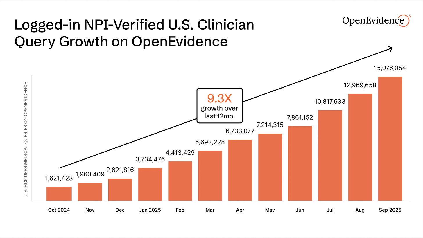Medicine is not immune to this temptation. Companies using large language models, such as OpenEvidence, Doximity, UpToDate, and Glass Health, are helping doctors answer clinical questions, provide diagnoses, recommend treatments, and more. Doctors are flocking to these tools en masse. On OpenEvidence alone, clinicians performed 15 million queries this September. A nine-fold increase from last year.